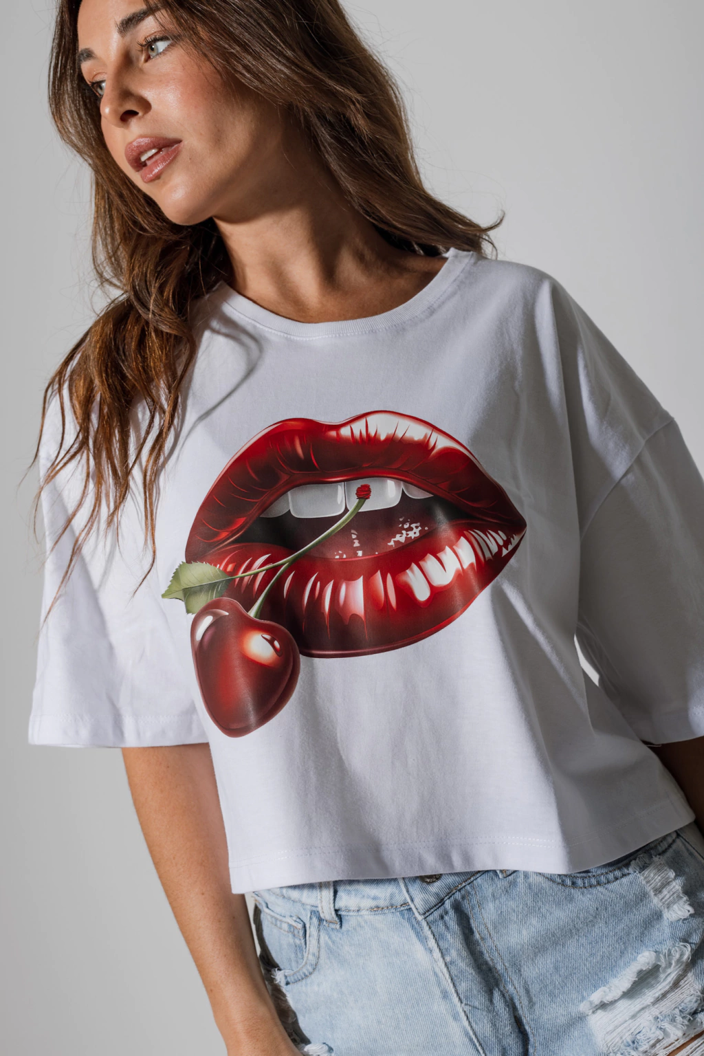 Remera Crop 100% Algodón con estampa de CHERRY LIPS Street Style full color. 🍒👄 Ultima tendencia.